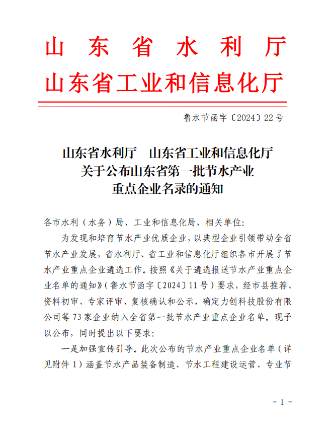 祝賀山東泰禾成功入選“山東省第一批節水產業重點企業名錄”